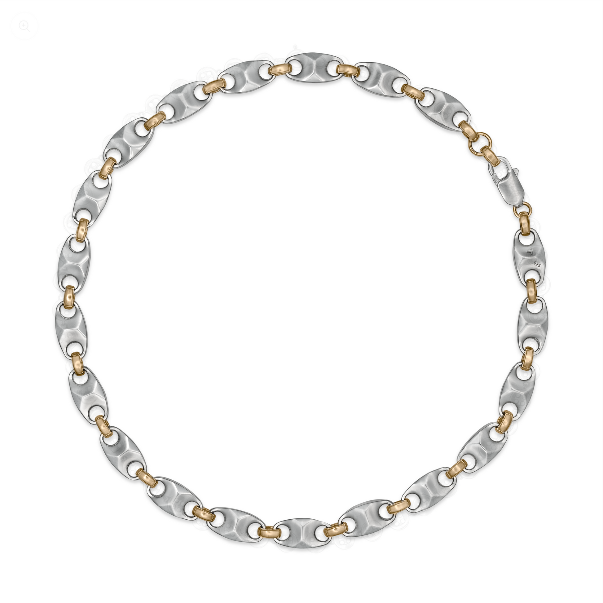 Java Sneak approaches the classic coffee-bean chain with greater mass and geometry. Each link is carved into a compact, concave form that uses light as its primary ornament—shifting reflections across sculpted surfaces as the piece moves.